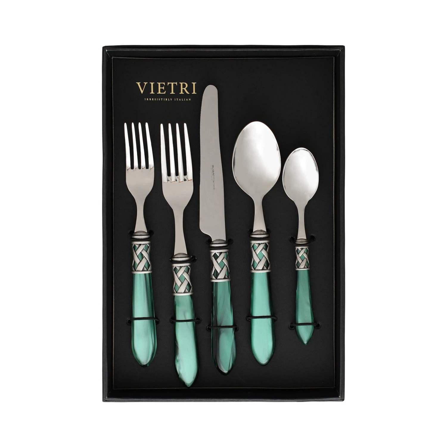 The Aladdin Antique Five-Piece Place Setting (Set of 4) features elegant pearlized handles with the strength of high-grade acrylic and 18/10 stainless steel. The handles are wrapped with intricate lattice metalwork.