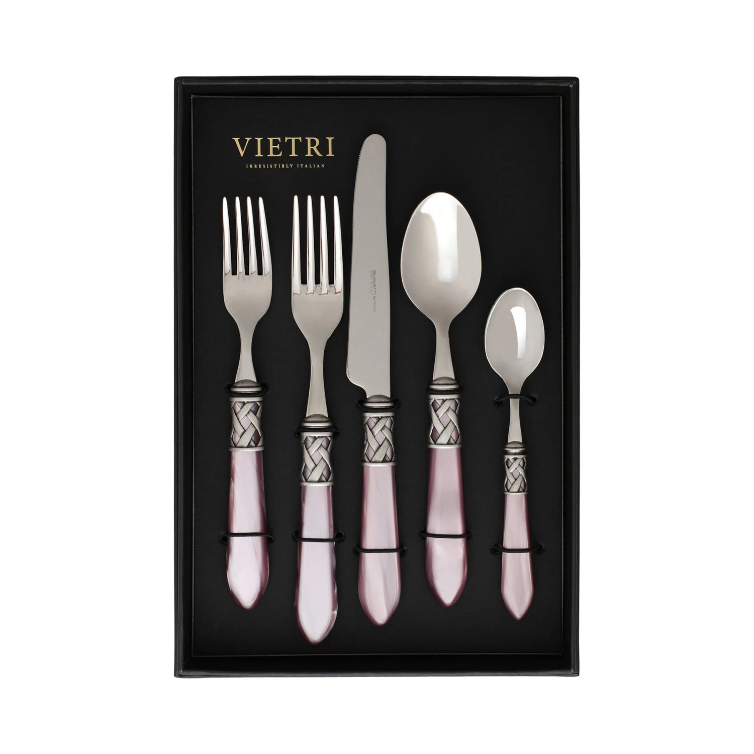 The Aladdin Antique Five-Piece Place Setting (Set of 4) features elegant pearlized handles with the strength of high-grade acrylic and 18/10 stainless steel. The handles are wrapped with intricate lattice metalwork.