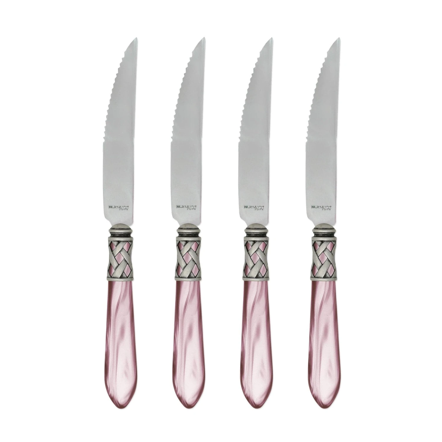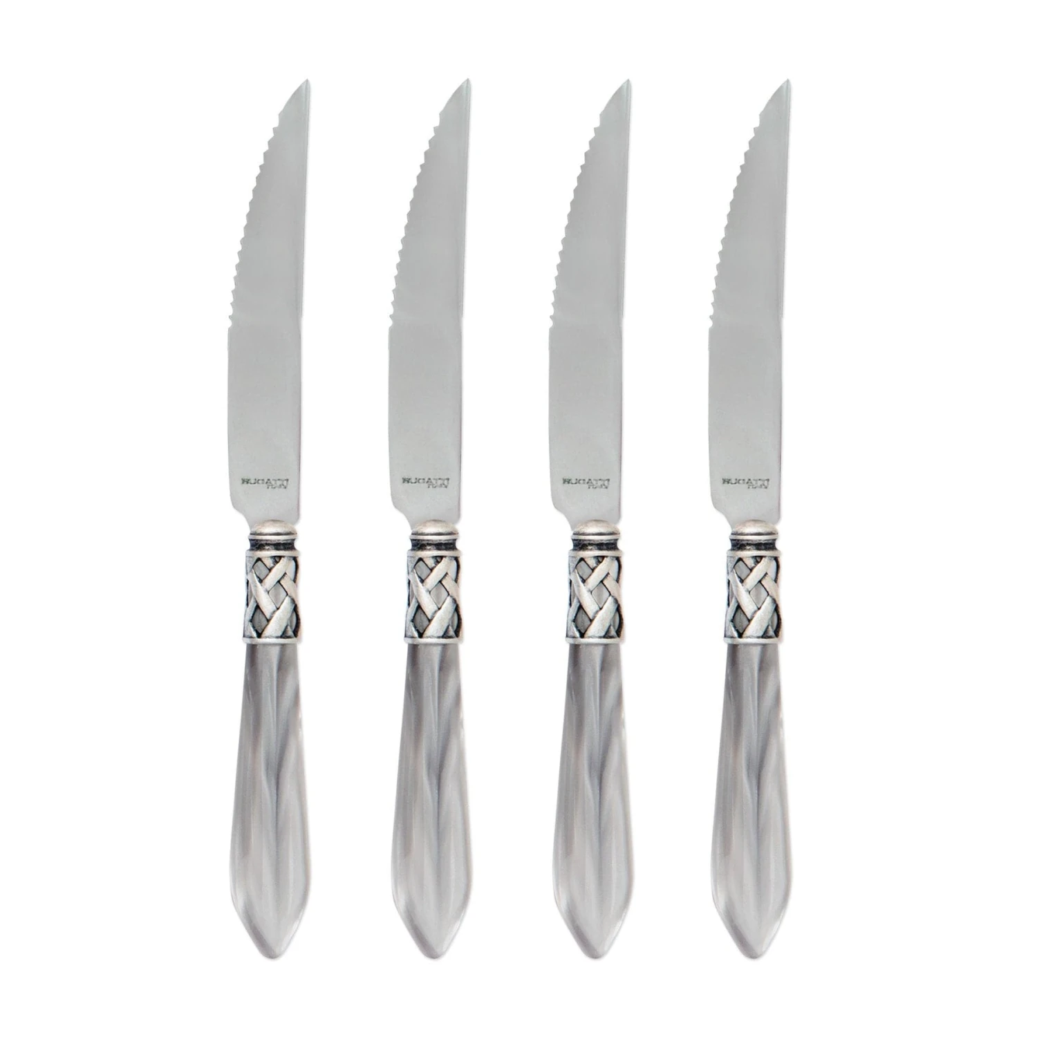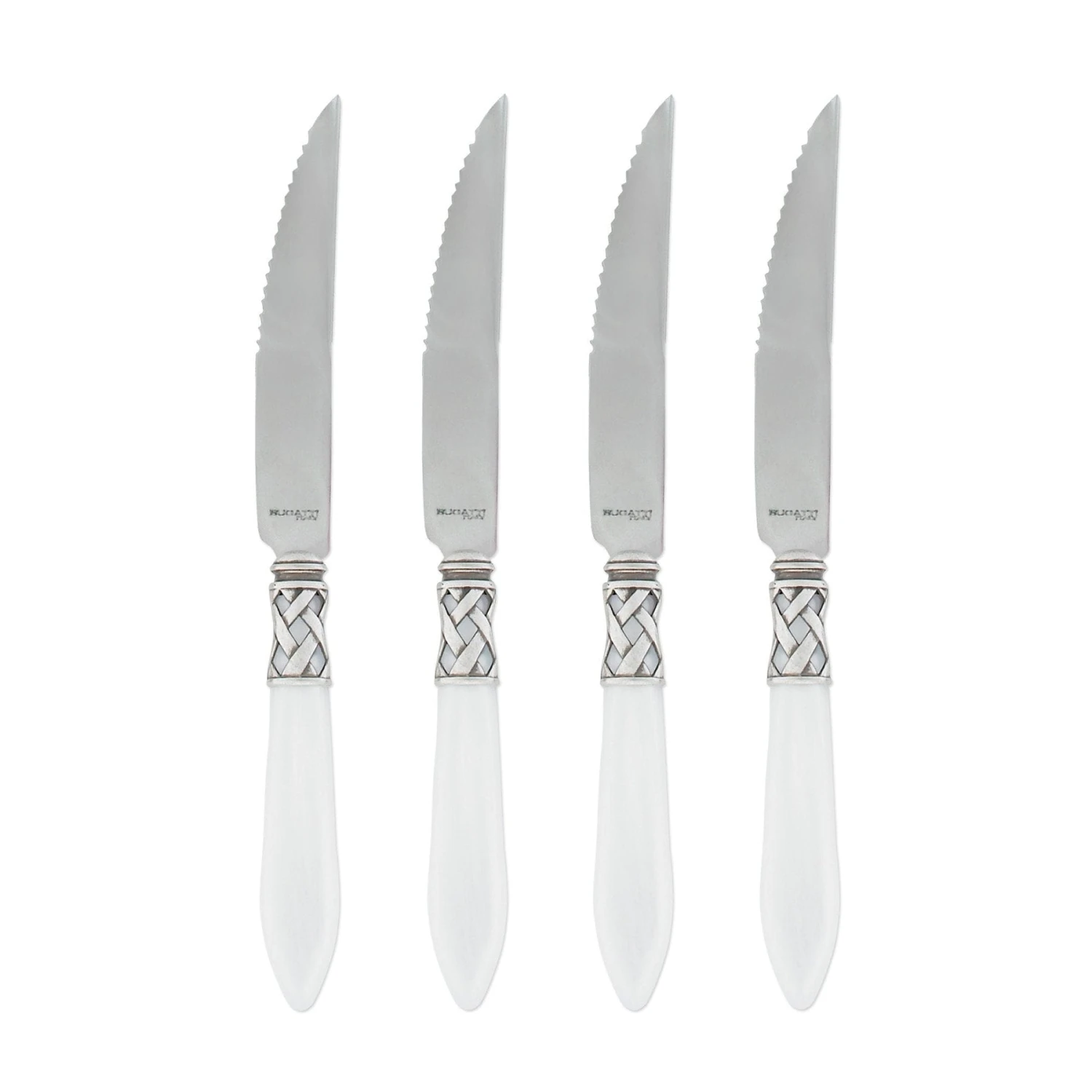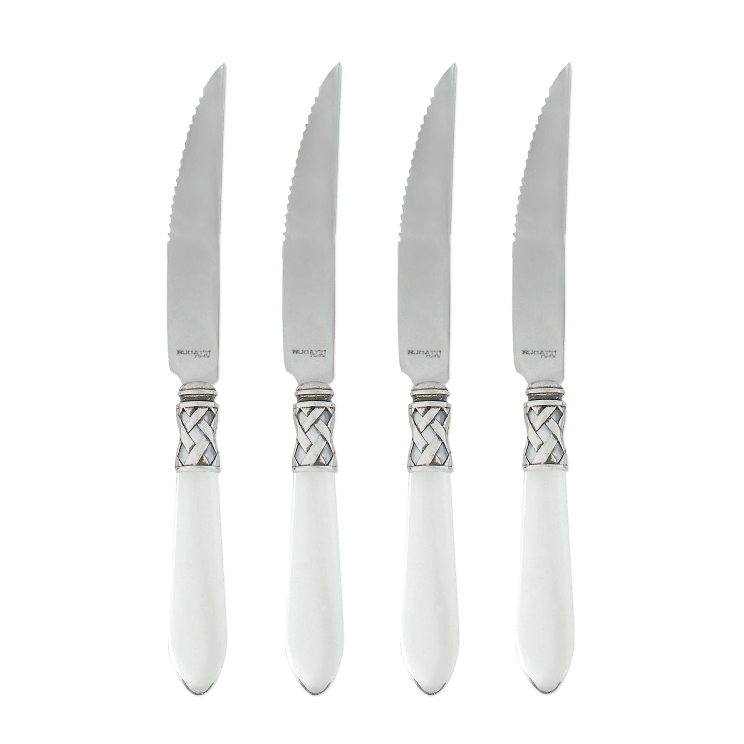 The Aladdin Antique Steak Knives feature elegant pearlized handles with the strength of high-grade acrylic and 18/10 stainless steel. This piece is also available in our brilliant finish.