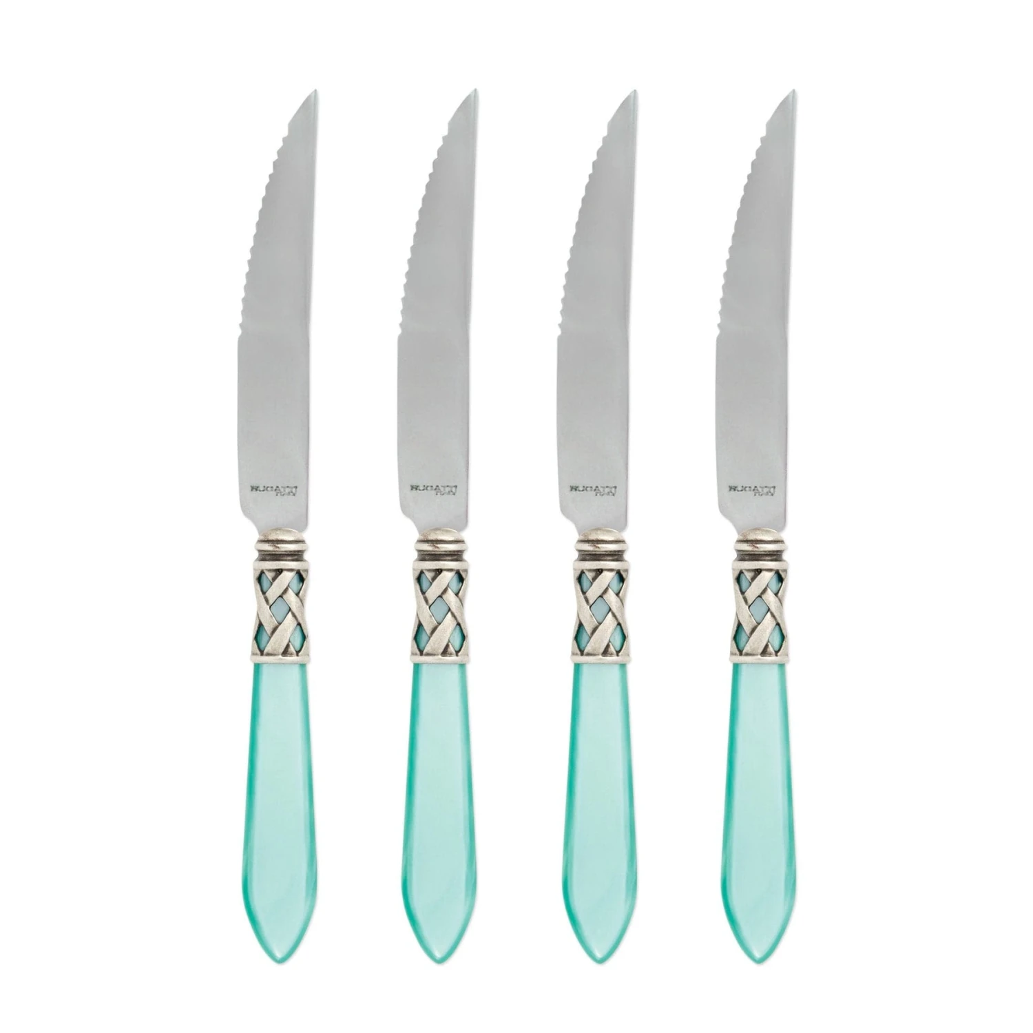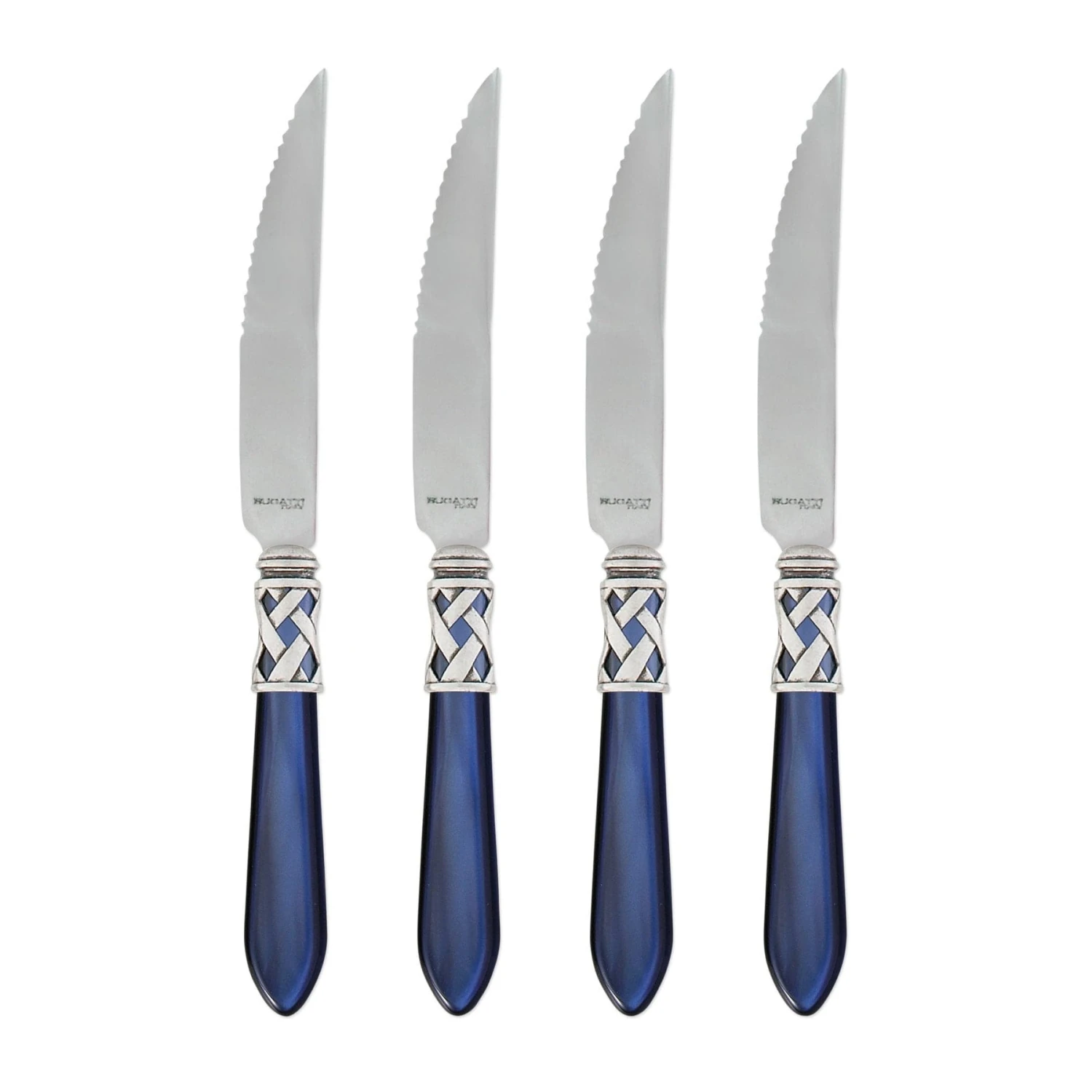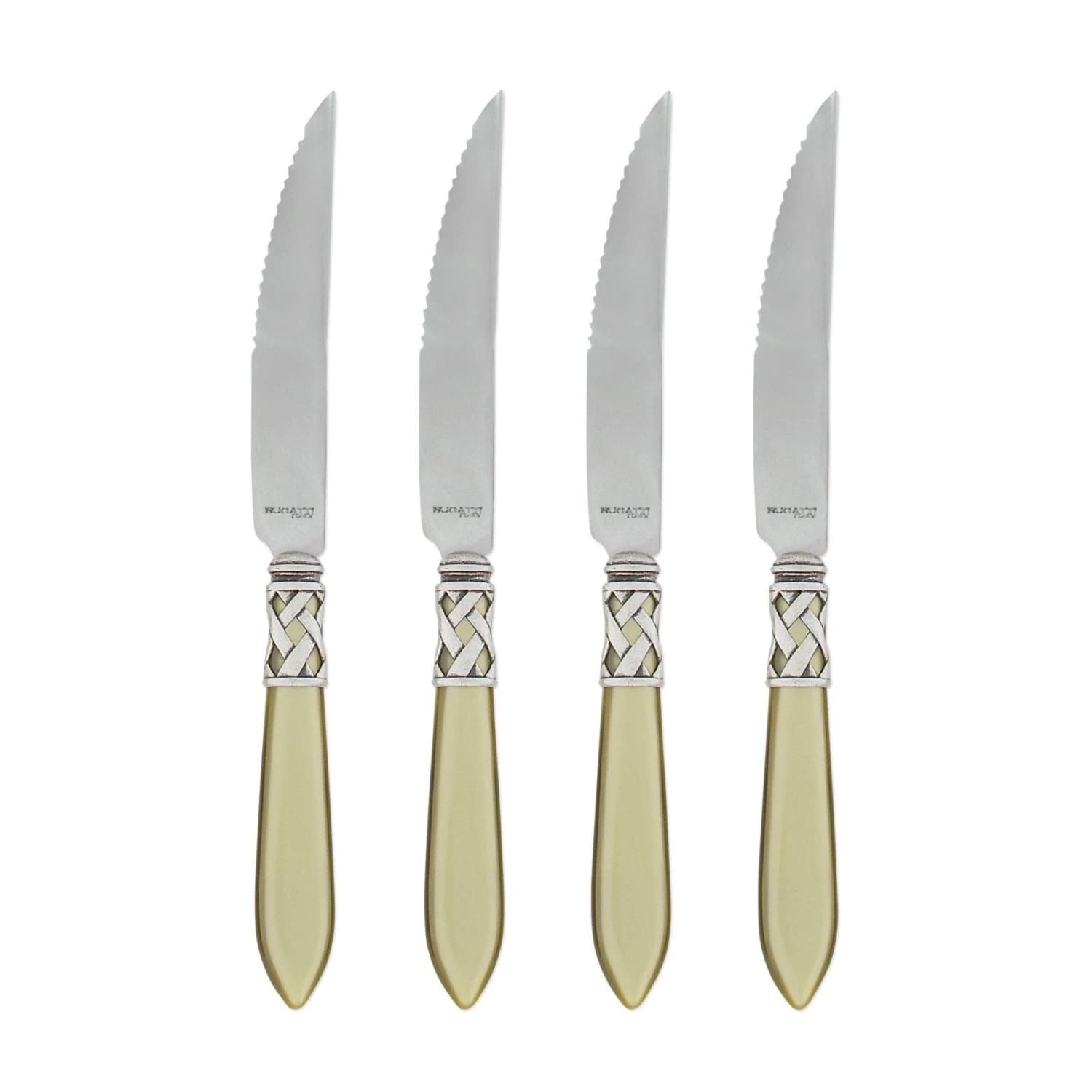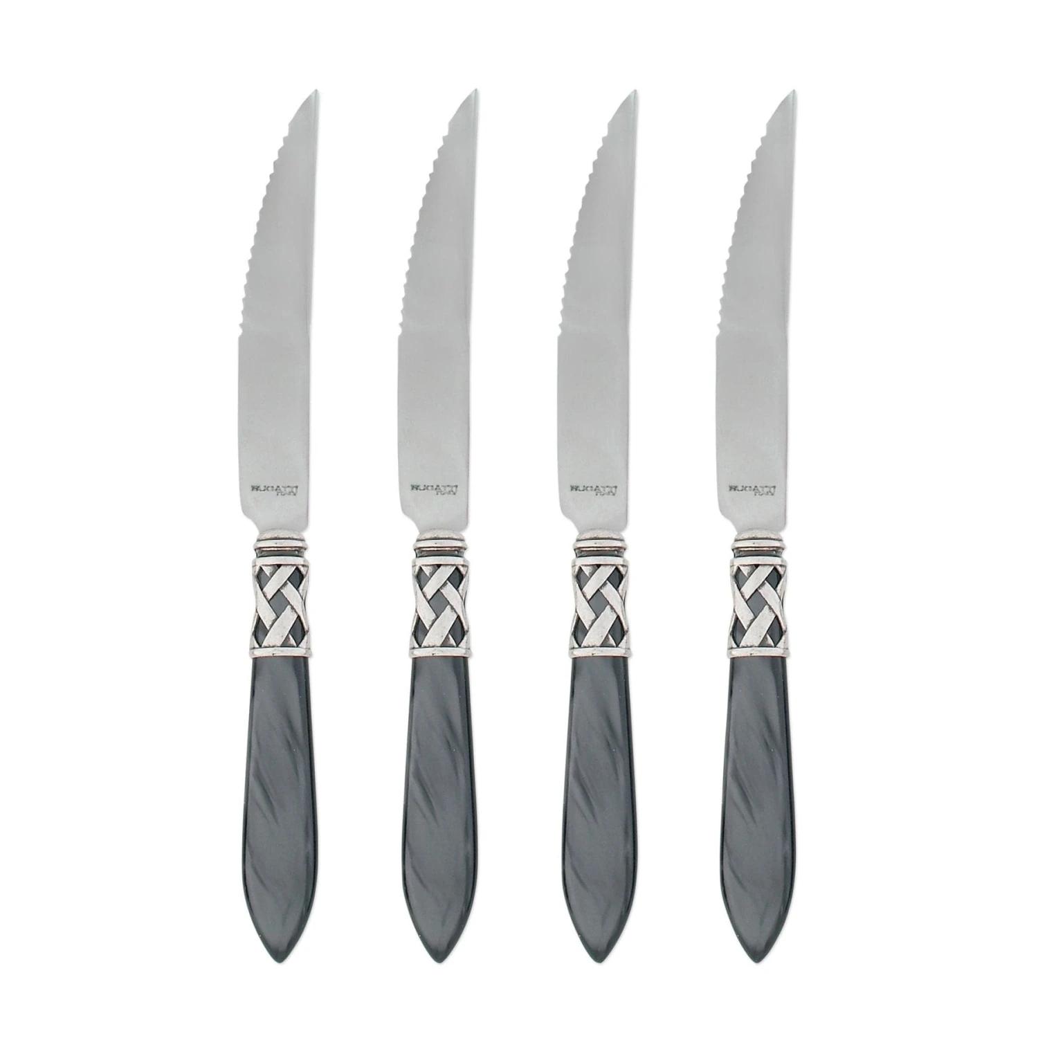 The Aladdin Antique Steak Knives feature elegant pearlized handles with the strength of high-grade acrylic and 18/10 stainless steel. This piece is also available in our brilliant finish.