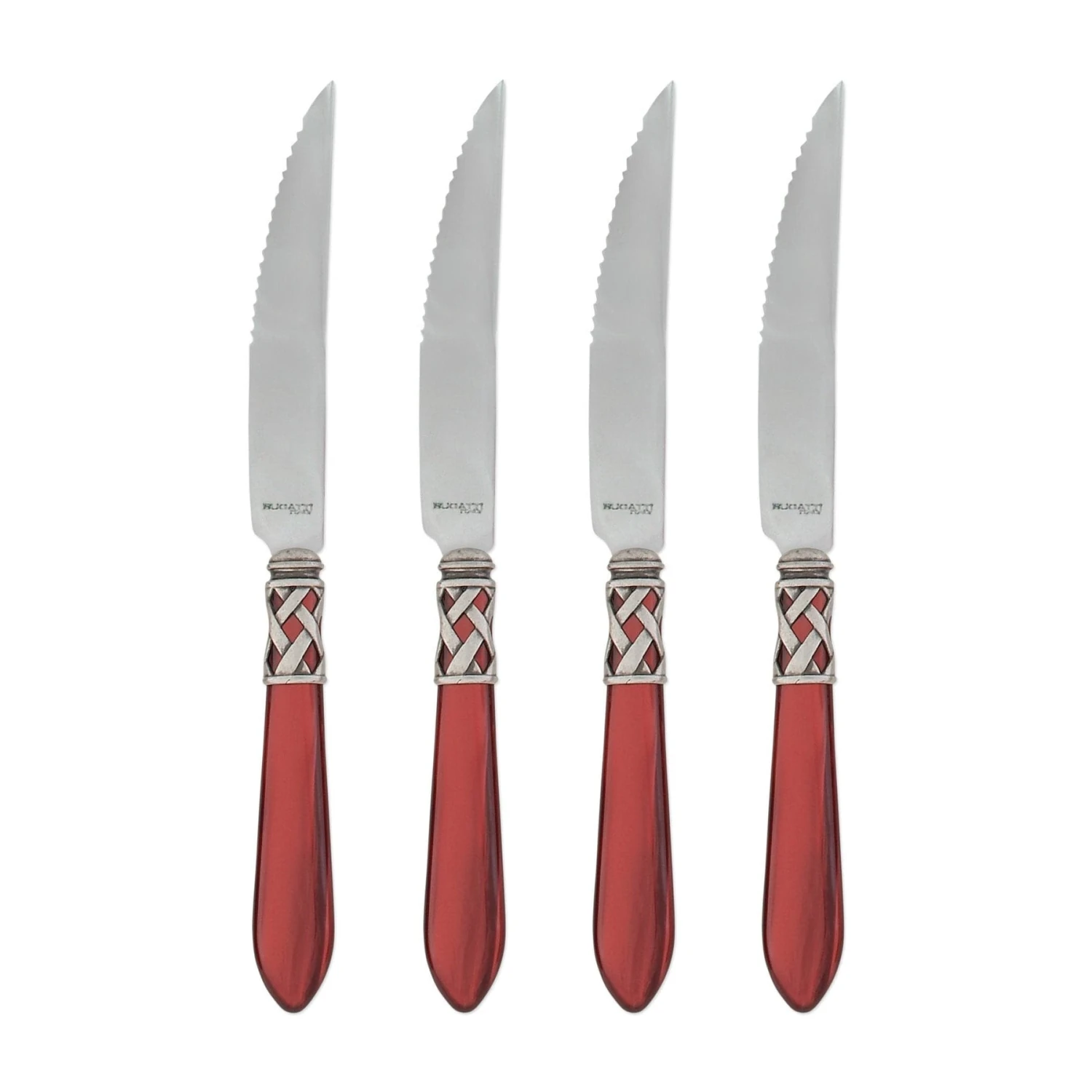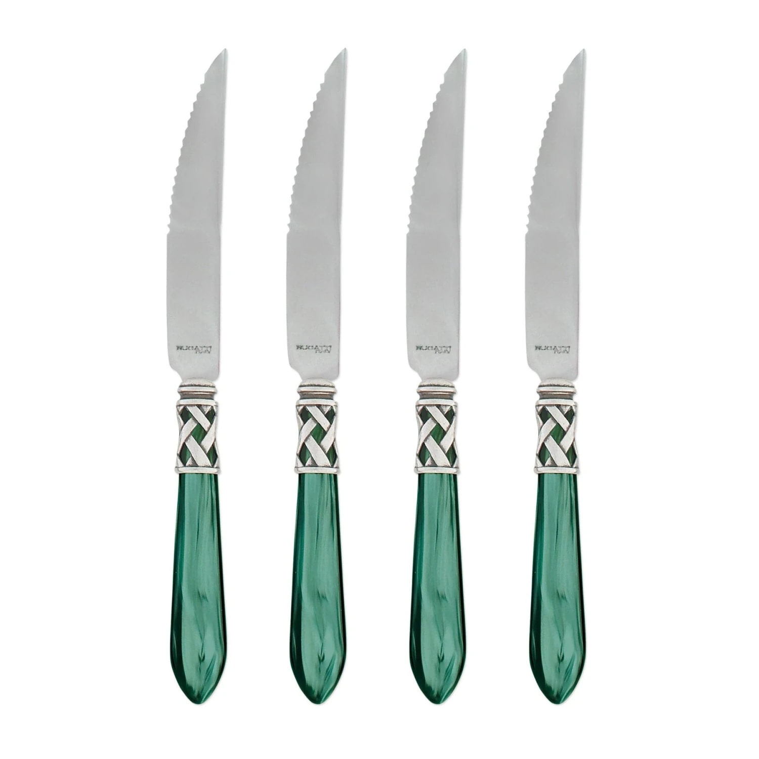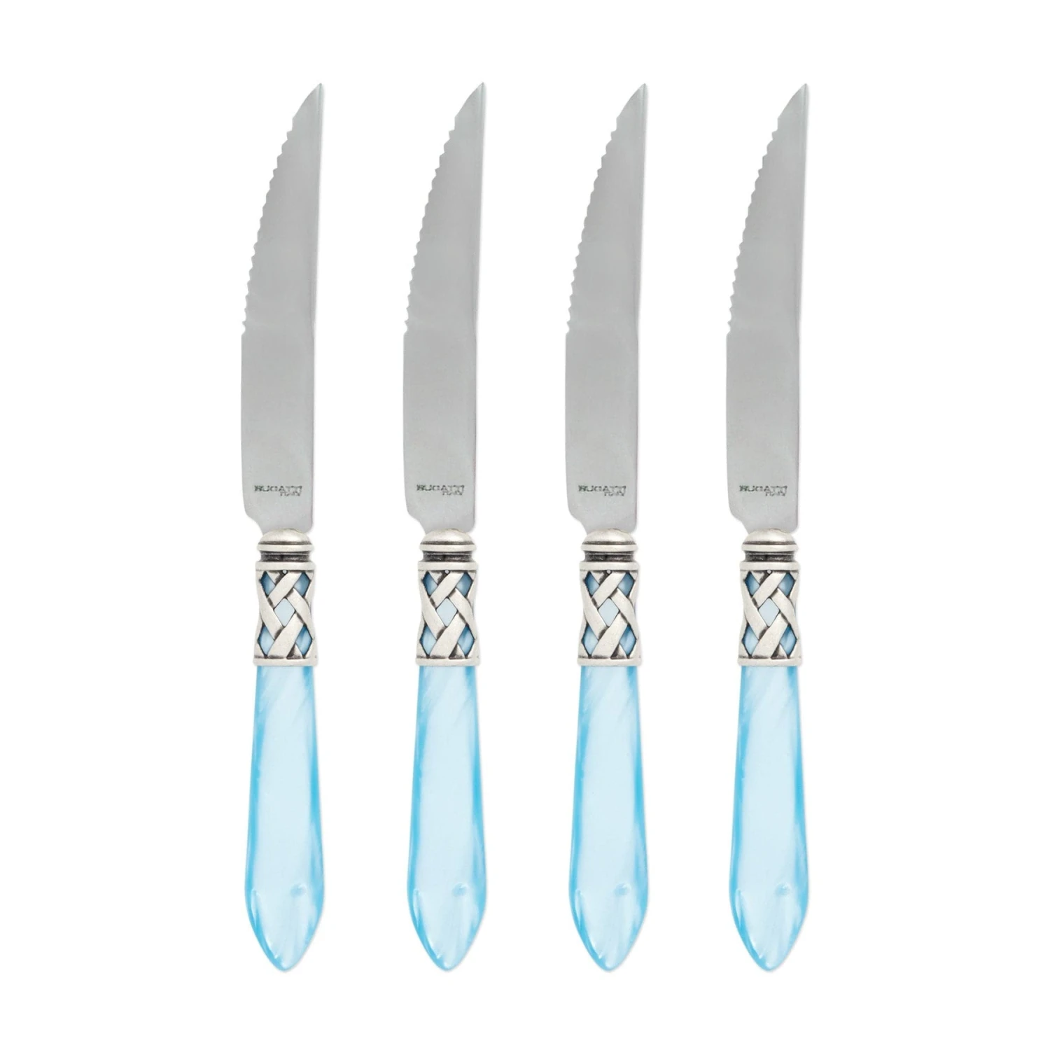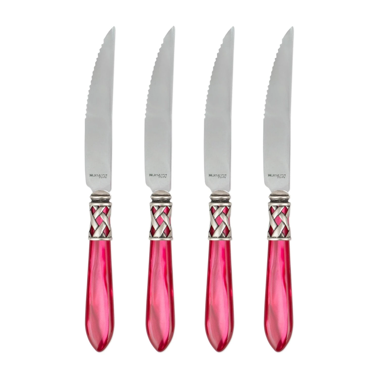 The Aladdin Antique Steak Knives feature elegant pearlized handles with the strength of high-grade acrylic and 18/10 stainless steel. This piece is also available in our brilliant finish.