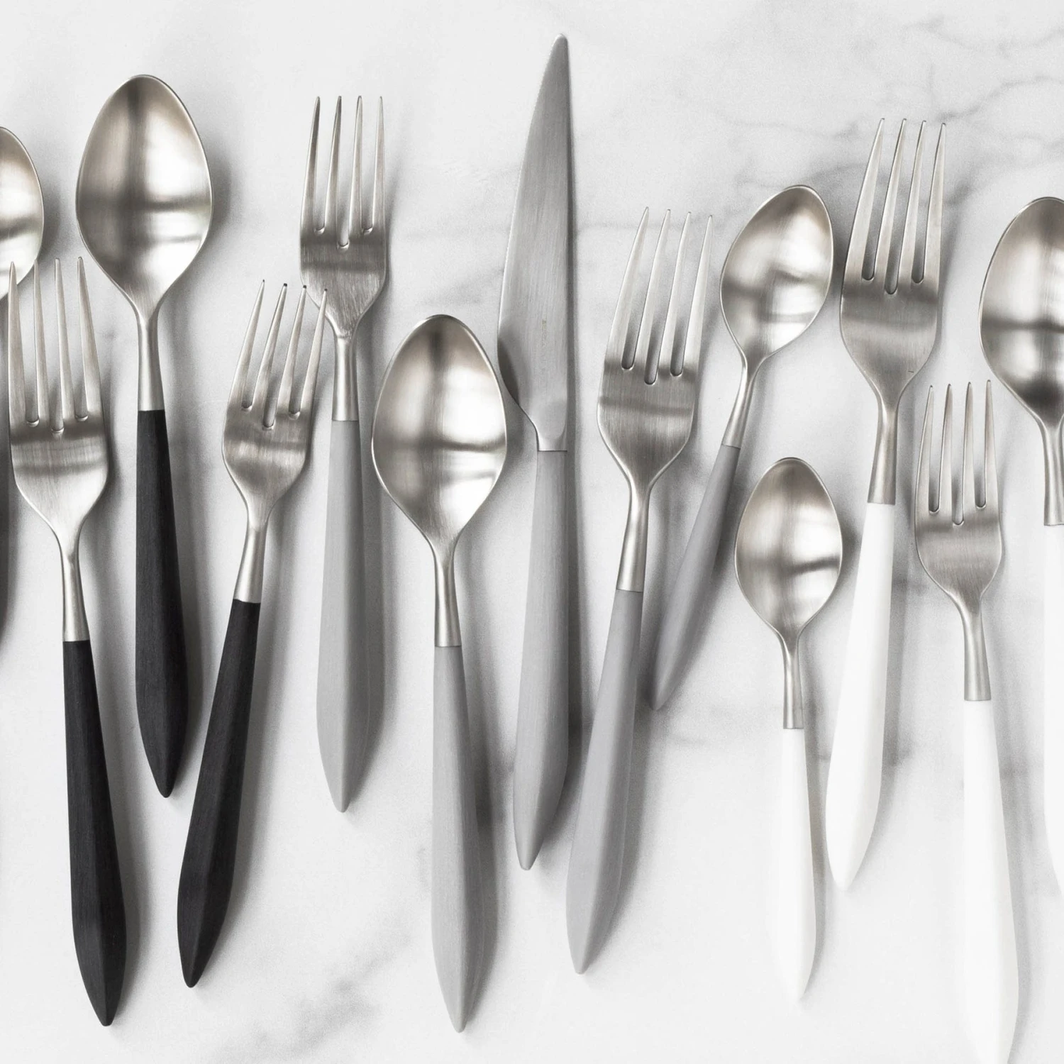 The contemporary matte handle found on the Ares Argento & Light Gray Five-Piece Place Setting provides perfect balance and weight for a luxury flatware experience. Argento, the brushed silver, finishes off the utensil in 18/10 stainless steel.