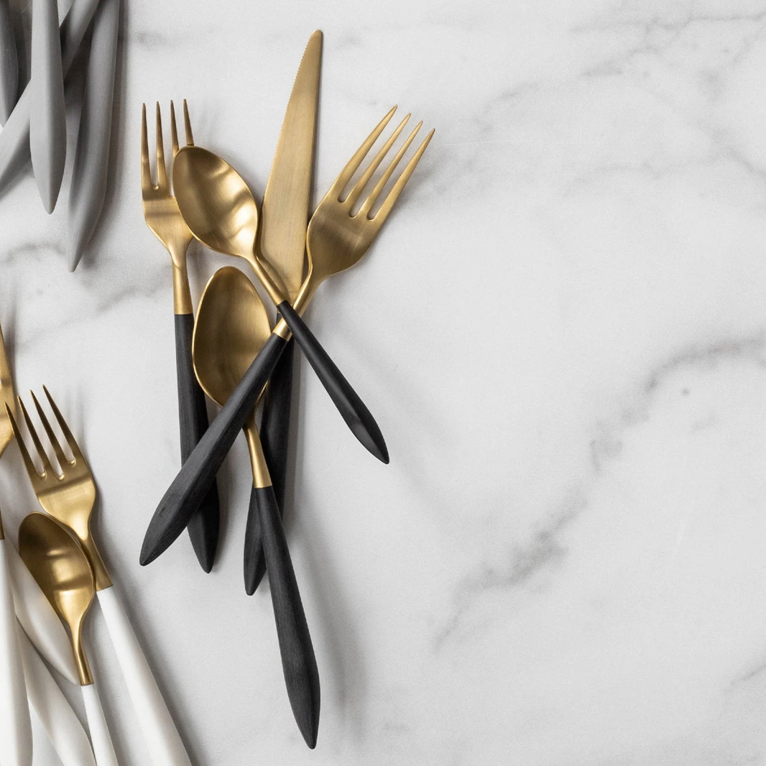 The contemporary matte handle found on the Ares Oro & Black Five-Piece Place Setting provides perfect balance and weight for a luxury flatware experience. Oro, the brushed gold, finishes off the utensil in 18/10 stainless steel.