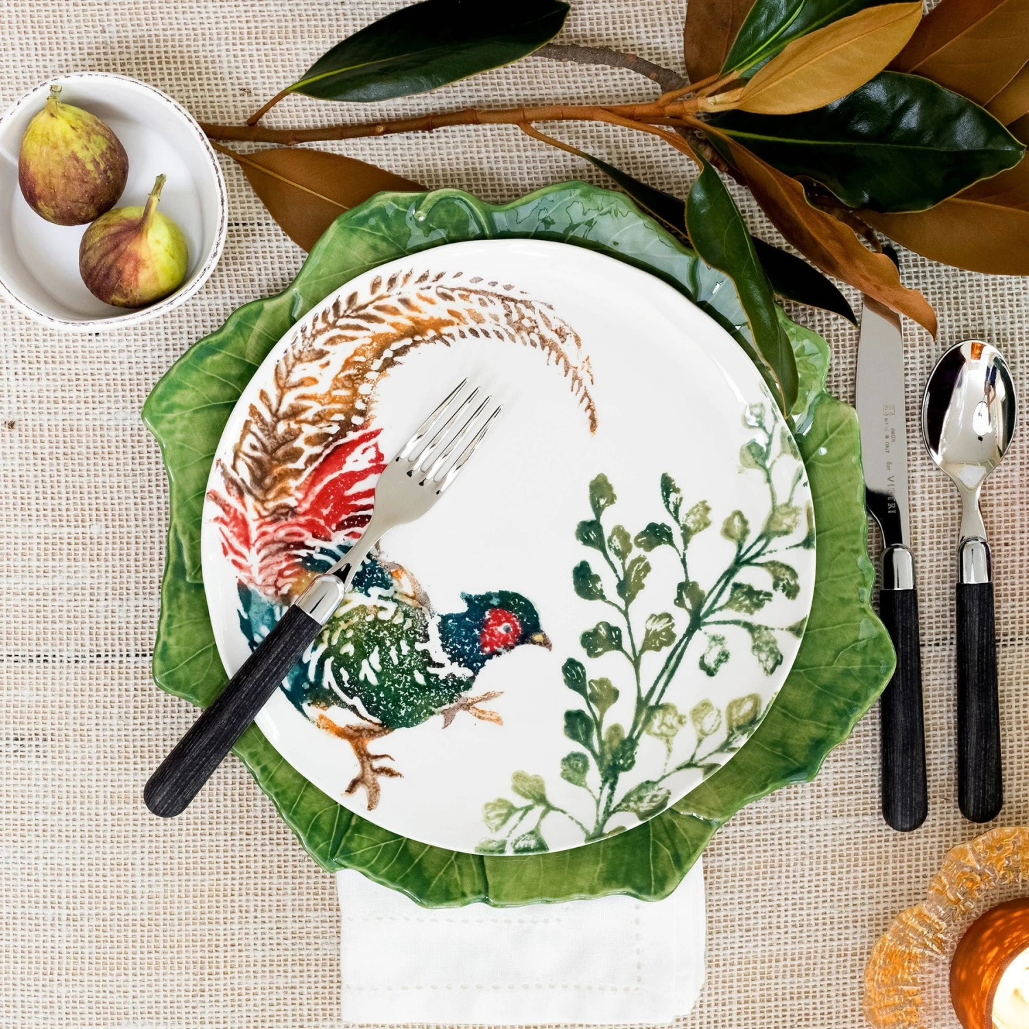 The Fauna Pheasants Salad Plate combines the outline of the classic hunting bird paired with nature’s greenery to depict what is commonly found during the hunt (la caccia) in Umbria, the Italian land known for capturing wild pheasants.