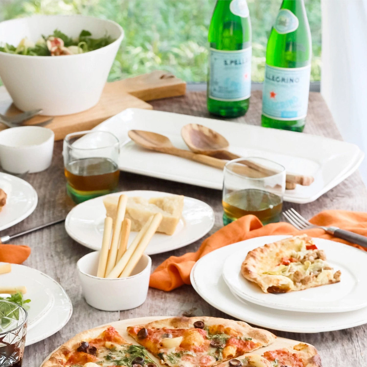 Beloved for its sophisticated simplicity, versatility, and durability, Lastra is our bestselling collection. The understated elegance, clean lines, and unique shape of the Lastra White Rectangular Platter make it a timeless choice for your table. Lastra’s design was inspired by the circular wooden slabs used for centuries to create the outer mold in cheesemaking throughout Italy. When fashioned together with twine, the hoop was left with a slight overlap to help maintain the shape of the cheese mold. Maestro molder Stefano Roselli incorporates the overlapping detail into the entire design, from its foot to its rim. A dark dusting on the edges of each piece suggests the ash that was used to preserve these cheeses and highlights each unique silhouette.