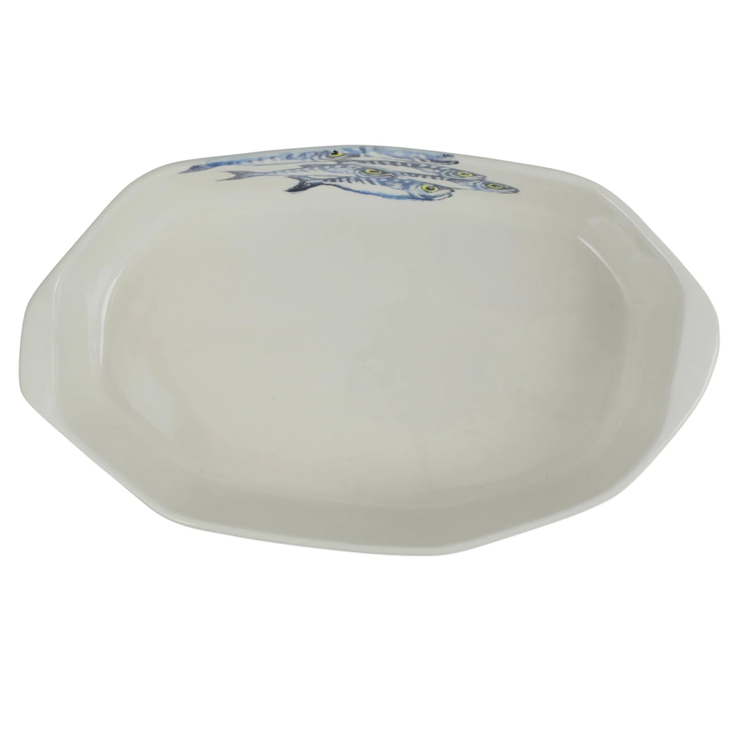 The Maccarello Baker illustrates a school of blue mackerel, commonly found along the Mediterranean and Adriatic Sea, handpainted by maestro artisan, Gianluca Fabbro, using his unique sponging technique.