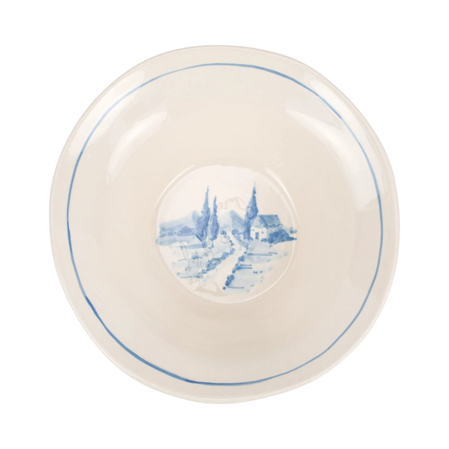 A handpainted Tuscan scene in a perennial favorite shade of light blue adorns the Modello Tuscan Large Serving Bowl.
