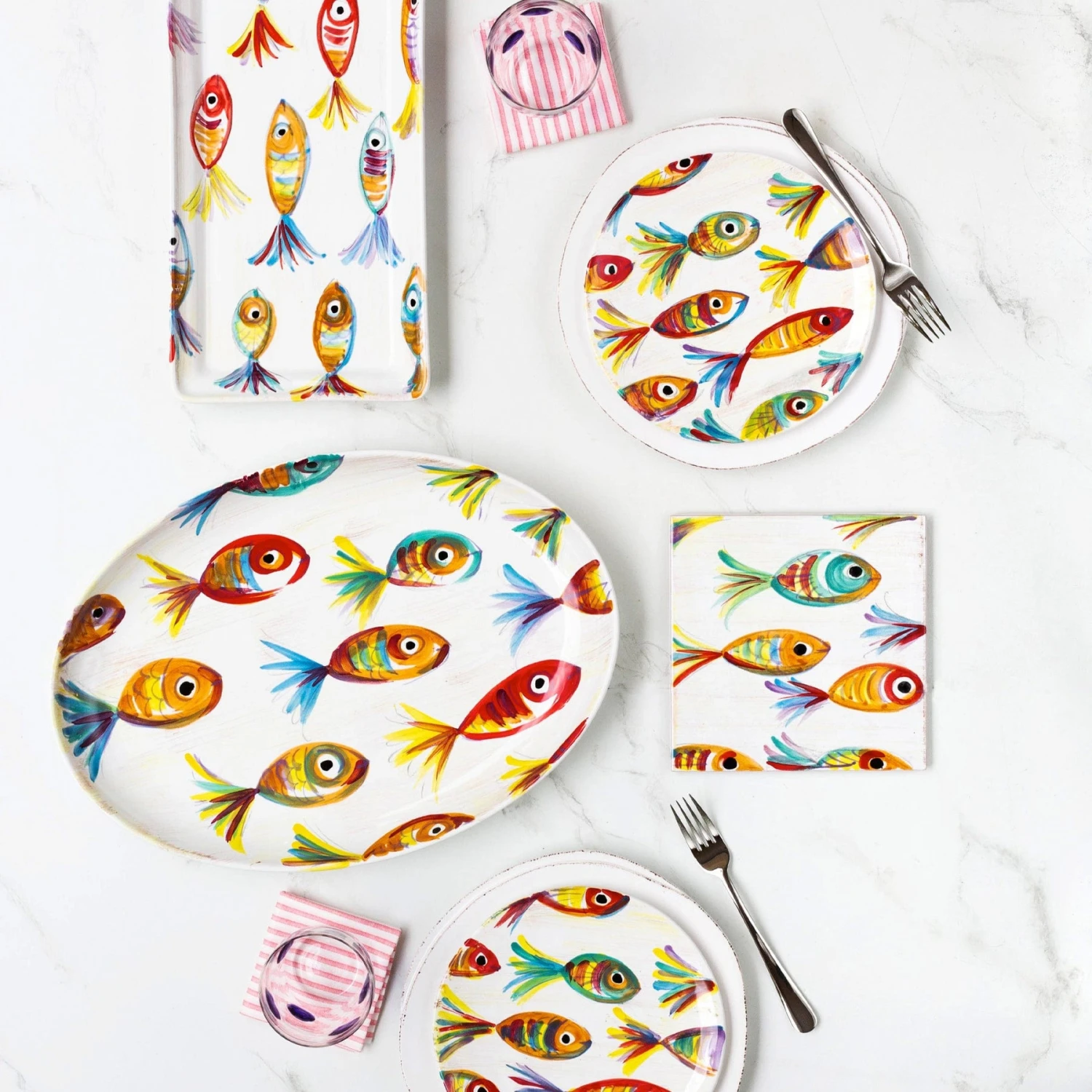 A traditional school of fish was the original inspiration for the Pesci Colorati Oval Platter. Our maestro artisans put their signature spin on the design with layers of color in handpainted detail to add variety and texture.