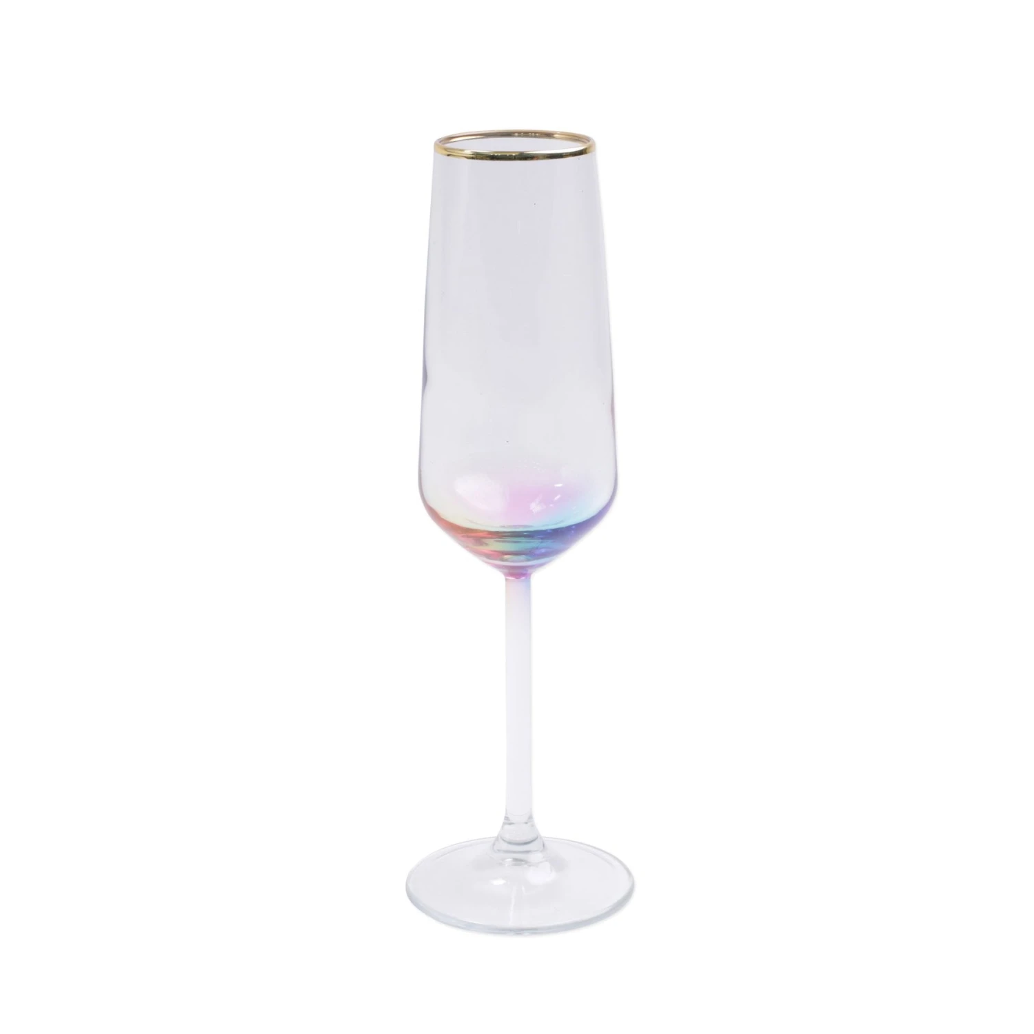 Add sparkle to any setting with a gilded gold rim and varied colored glass that refracts light on the Rainbow Champagne Flute.